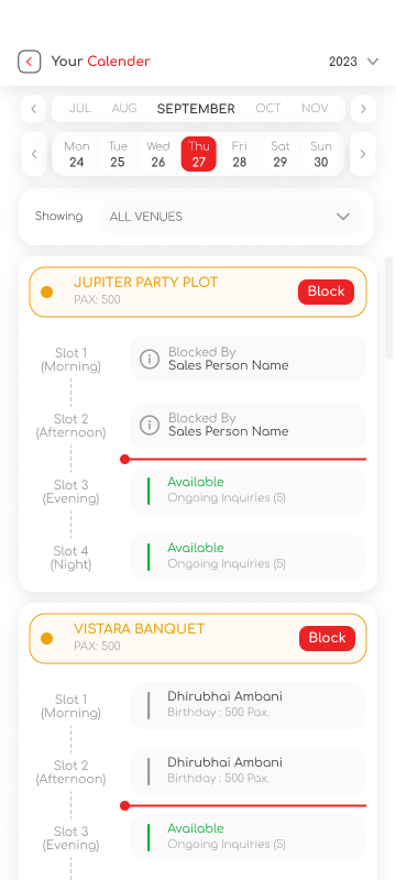 Easily check the availability of your banquet or party plot directly in your calendar. You can also access your bookings calendar to keep track of all your scheduled events. Receive timely reminders to assist you in your planning process.